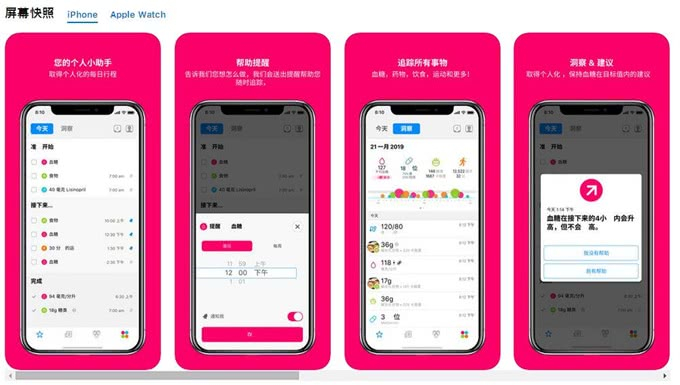 糖尿病不仅涉及人群逐渐增长,且它需要长期管理——而通过智能手机记录和提醒,是让糖尿病人知晓自己病情一种很好的方式。使用该应用程序,能集中跟踪患者葡萄糖水平,摄取的食物,活动和药物等方面的数据。