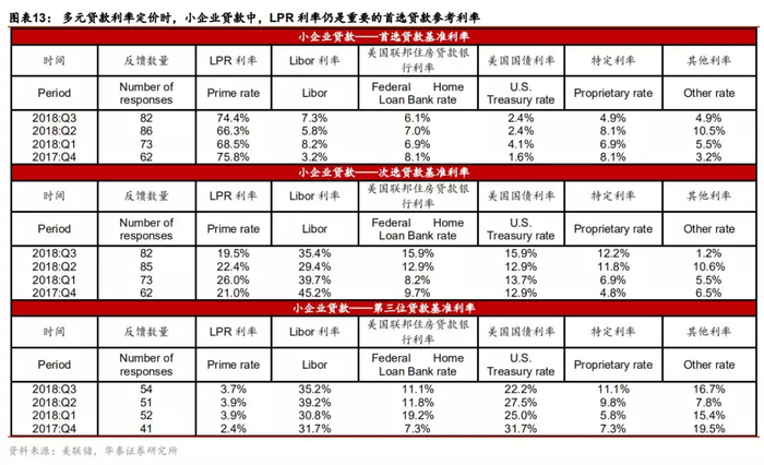 2017年二季度前,美联储定期进行商业贷款调查(Survey of Terms of Business Lending),该调查报告定期披露工商贷款是以何种基准利率进行贷款定价的,2017年二季度暂停了商业贷款调查(STBL),转而进行小企业贷款调查(Small Business Lending Survey)。商业银行在进行贷款利率定价时,仅根据单一利率基准进行贷款定价的较少,大多商业银行会借鉴等多种贷款利率基准。根据该小企业贷款调查报告披露,2017年四季度至2018年三季度之间,使用单一贷款基准利率定价的各类小企业贷款中,90%以上是以LPR利率进行定价的;使用多种贷款基准利率定价的,66%以上的贷款首选以LPR利率定价,即便不作为首选基准利率定价,作为次选基准定价利率,仍有近20%以上的贷款选择LPR利率。从小企业贷款角度综合来看,商业银行主要选择LPR利率作为贷款基准利率,侧面体现了该利率仍具有一定重要性。