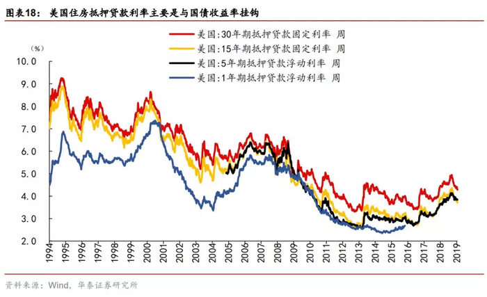 美国住房抵押贷款可分为1年期和5年期可调整利率抵押贷款(the adjustable-rate mortgage,ARM)、15年和30年期固定利率抵押贷款(the fixed-rate mortgage,FRM),根据久期匹配的原则,1\/5年期的可调整利率抵押贷款与1年期国债利率挂钩,而15年期和30年期固定利率抵押贷款分别与10年期和30年期国债利率挂钩。从1971年开始,房地美(Freddie Mac)开始对住房抵押贷款市场进行调查(The Freddie Mac Primary Mortgage Market Survey ,PMMS)以确定抵押贷款利率的周度平均值,该调查针对储蓄机构、信用合作社、商业银行和抵押贷款公司等机构进行,并于每周四公开调查结果。