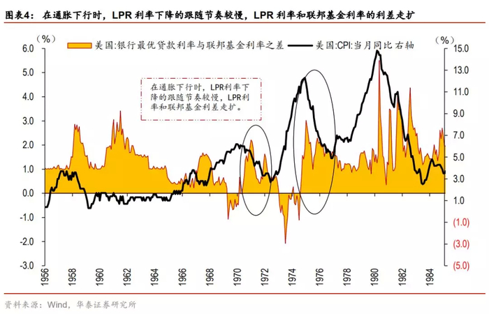 从20世纪30年代至20世纪70年代间,由于LPR利率是美国众多贷款的基础参考利率,各家商业银行在参与LPR利率报价的过程中会参考联邦基金利率,当联邦基金利率开始上行时,LPR利率也相应升高,间接完成了货币政策传导机制的衔接,这一时期,两者形成了较好的联动作用。但与此同时也暴露出部分问题,20世纪60年代起,美国通胀水平抬升导致联邦基金利率相应升高,LPR利率的部分弊端开始显现,第一,联邦基金利率敏感性显著高于LPR利率,通胀快速上行时期联邦基金利率超过LPR利率,从商业银行角度来看相当于入不敷出了(资金收益小于资金成本);第二,在通胀和联邦基金利率下行时期,LPR利率跟随联邦基金利率下降的节奏较慢,主因在于,降低下降节奏可以扩大两者利差,利差走扩意味着银行的资金收益较资金成本增加,可以为商业银行带来更多利润。