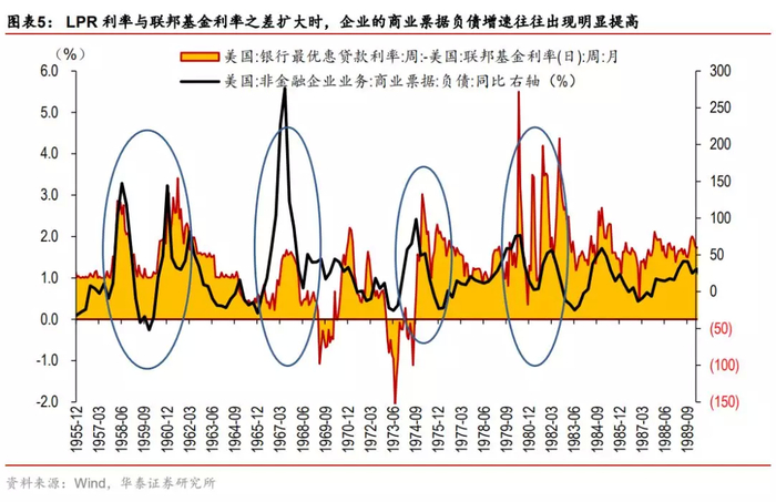 也是在20世纪70年代至80年代间,企业融资渠道进一步丰富,在贷款端,越来越多企业选择通过发行商业票据来满足短期资金需求,并通过票据融资来降低银行的“转嫁成本”,银行“转嫁成本”的产生源于LPR利率较联邦基准利率下调存在时滞(即LPR下调节奏较慢),根据美联储数据显示,当LPR利率与联邦基金利率之差扩大时,企业的商业票据负债增速往往出现明显提高。