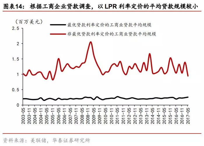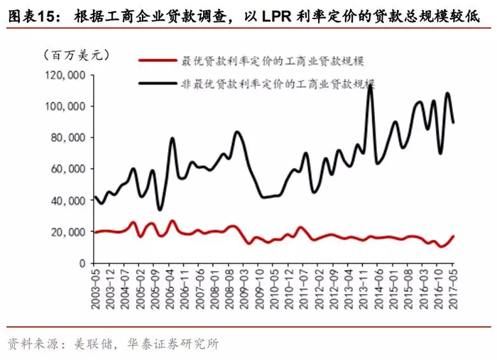 根据美联储工商贷款调查(于2017年5月暂停)报告显示,LPR利率在贷款定价过程中的应用程度不断下降,截至2017年5月,工商企业中以LPR利率进行定价的贷款占比不足16%,其中,美国本土大型商业银行仅有17.6%以LPR定价,超过80%的贷款是基于LPR以外如LIBOR,国债利率,住房贷款利率等进行定价,而在本土小型商业银行中,以LPR定价的贷款余额为31.11亿美元,占比高达59.4%,说明议价能力较弱,资金规模较小的本土小型商业银行是LPR定价基准的使用主体。