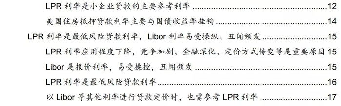 多重原因促发LPR利率应用程度下降,同业竞争加剧、金融深化、企业议价能力及定价方式变化等均有影响。与LPR利率应用程度下降相对应的是,以Libor利率进行定价的金融产品自20世纪80年代以来较快增长,但由于Libor是基于报价而非真实交易得出的利率,无法保证银行报价的真实性,报价行操纵Libor的丑闻频频发生。我们认为,即便当前以LPR利率直接定价的应用程度较低,考虑LPR利率作为最低风险贷款利率,类似贷款定价的无风险利率,使用其他利率定价时仍需参考LPR利率,定价过程表现为LPR利率加期限风险补偿和违约风险补偿。
