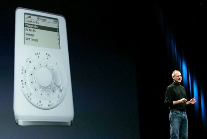两年后的苹果设备及配件博览会上, 在介绍 iPhone时, 乔布斯开玩笑似的在 iPhone的屏幕上展示了一张带有旋转拨号器的 iPod图片。 他说, 这幅图告诉我们, 不要去制作这样一款新手机。 观众看到以后捧腹大笑, 可很少有人知道苹果当初差点就真的推出了这样一部手机。