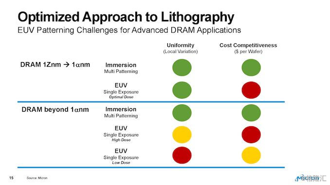 EUV不仅对逻辑有挑战,而且在均匀性和成本方面也对DRAM制造提出了挑战。Micron认为,目前EUV工具只有在发出高剂量的EUV辐射(在单一 patterning化的情况下)时才能保证可接受的均匀性,这会将晶圆成本增加到不可接受的水平。因此,美光公司没有立即使用EUV的计划,但它正密切关注其演变和发展。
