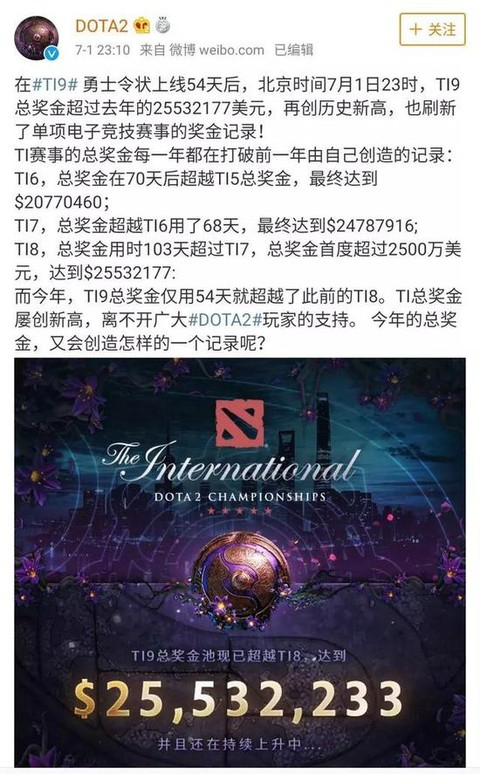 7月1日,Ti 9总奖金仅用54天,就再次超越Ti 8,达到25,532,233美元,刷新了单项电子竞技赛事的奖金记录。而且这是在不朽二和不朽三都还没有发售的情况下,可以预见Ti 9的总奖金会持续攀高。