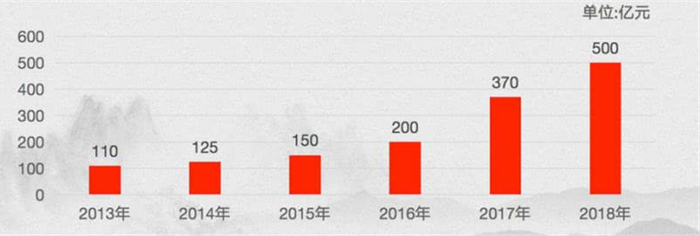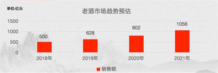 中国酒协联合歌德盈香发布的《中国老酒市场指数》显示,2013年至2018年,茅台、五粮液、汾酒、泸州老窖、剑南春、洋河、古井贡、郎酒、西凤、董酒等品牌的老酒市场规模持续扩大,特别在2016-2017年老酒的市场规模涨幅高达85%,2017年的市场规模达到370亿元,2018年达到500亿元,2021年预计酒的市场规模将达到千亿。