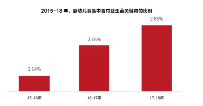 其实,消费者对益生菌营养物质一直有良好的认知,京东消费数据显示,59.3% 的中国消费者希望购买添加了益生菌的产品。2017-2018年间婴幼儿食品中含有益生菌的产品相较于2015-2016年间,同比增长了250%。在京东电商上,消费者搜索的关键词中,益生菌占比也名列前茅。