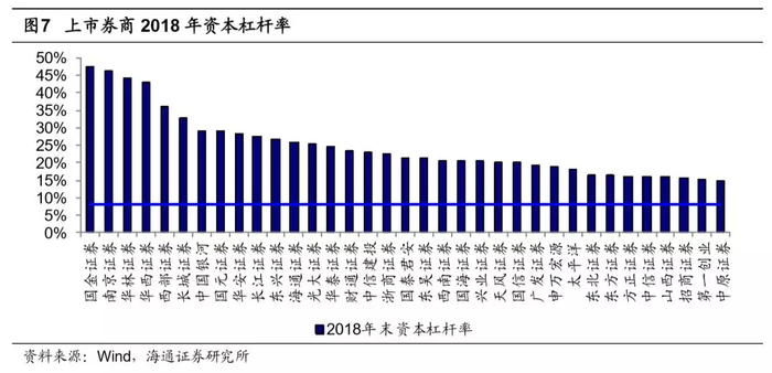 2016年10月开始施行的《证券公司风险控制指标管理办法》,对券商资本金提出了的新要求。由风险覆盖率、资本杠杆率、流动性覆盖率、净稳定资金率等四大核心指标构建的风险管理体系全面进入证券公司经营管理实践,风险管理进一步向纵深发展,综合考虑表内外资产、境内外子公司等等。其中,新规要求资本杠杆率不得低于8%,2018年上市券商平均资本杠杆率为25%,远高于监管标准,因此我们认为境内券商加杠杆空间充足。