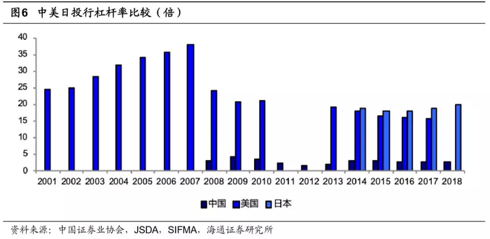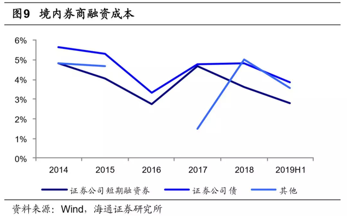 境内券商杠杆率一直以来均处于较低水平。据中国证券业协会数据,2008-2018年境内券商的平均杠杆率(剔除客户保证金)仅为2.8倍;相比之下,美国投行的杠杆率普遍超过15倍,金融危机前更是高达30倍左右;日本近五年杠杆率也将近20倍。究其原因,我们认为偏低的杠杆率与资金成本、负债结构、业务结构等有关。