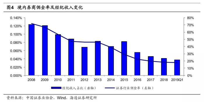 由于境内券商业务模式缺乏亮点,同质化较为严重,随着金融牌照放开、行业壁垒逐渐缩小、业内竞争加剧等因素,券商利润率逐渐被挤压。竞争加剧在经纪业务佣金率上体现的尤为明显,据证券业协会的数据,2008年行业平均佣金率为0.126%,2013年下降到0.081%。2013年后,随着佣金宝的推出、佣金战的全面打响,券商佣进入“万3时代”。据海外成熟市场的经验,佣金自由化是行业发展必经之路。1975年美国率先打破了固定佣金制而采取竞争性的协议佣金制,其后欧洲、日本、韩国等都通过改革实现佣金自由化,带来证券行业转型与创新高潮。