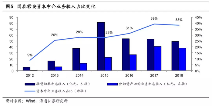 2012年创新大会后:通道业务利润率压缩,资产负债表的扩张反而拉低券商ROE。2012年创新大会鼓励券商创新转型以后,券商资本中介类业务(融资融券及股票质押等)迅速发展,并成为继经纪业务、自营业务后第三大收入来源。以国泰君安为例,资本中介业务收入占比由2012年9%提升至2018年的38%,若考虑资金成本,预计净收入贡献也在20%以上。两融和股票质押均为资本消耗性业务,利差在2-3%左右,依赖于资产负债表的扩张,反而拉低了券商ROE。