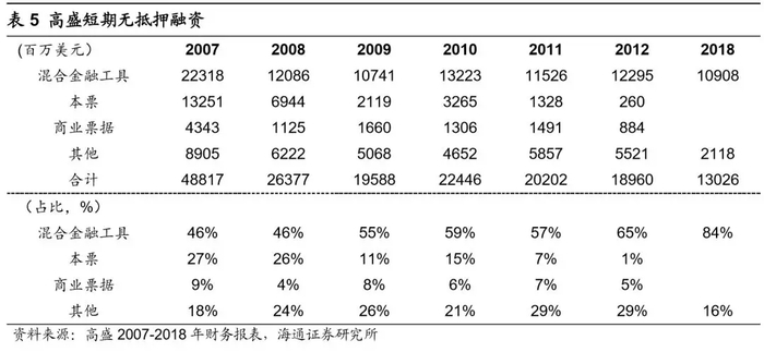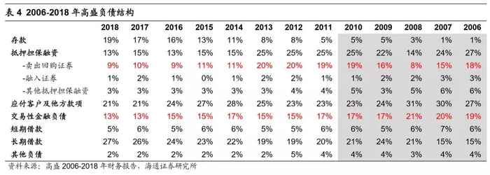 从负债结构来看,短期融资的变化尤为明显。1)卖出回购金融资产:通过美国发达的回购市场实现借短还长,通过不断展期以实现大幅加杠杆的目的,金融危机后市场风险偏好大幅下滑,加之监管从严,在负债结构中的占比大幅下滑,以高盛为例,由2007年的15%下滑至2018年的9%;2)交易性金融负债:衍生品业务收入的下滑,使得围绕着产品创新、做市业务的交易性金融负债占比由2007年的20%下滑至2018年的13%。