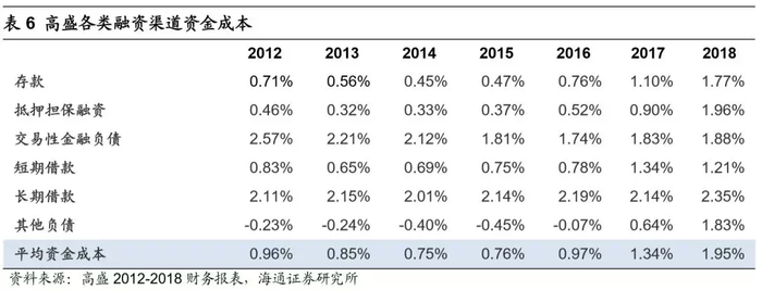 从负债端来看,类比美国主要投行,券商整体的加杠杆成本较高。2014-2019H1期间,境内短\/长期发债成本在4%左右,回购利率也在3-4%。而高盛近5年的平均融资成本在1.15%,成本区间在0.75%-1.95%。2018年平均融资成本1.95%,其中:抵押类融资成本(回购及融入证券)在1.96%,长期无抵押发债成本在2.35%,短期无抵押借款成本在1.21%,交易型金融负债在1.88%。