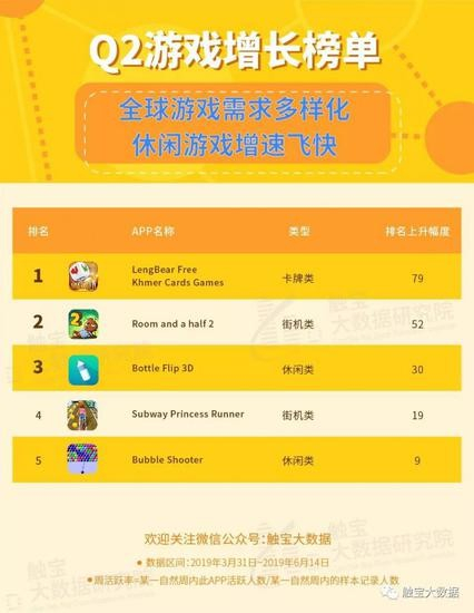 在本季度海外游戏行业当中,新入榜的游戏种类较为多样,街机类与休闲类是增长较快的两类游戏。这两类游戏制作门槛较低,用户上手较快,也很容易获得用户。休闲类游戏当中,增长较快的Bottle Flip 3D和Bubble Shooter都是规则简单,无需社交的游戏种类,因此可以快速获客,而多元化休闲游戏的快速增长证明了用户在即时娱乐方面的巨大需求。