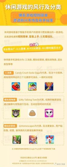 休闲游戏是基于智能手机用户的使用习惯发展出的一类游戏,这类游戏通常规则简单,容易上手,且无需组队。玩家可利用自己的碎片时间随时开始游戏。这类游戏对于手机性能的要求较少。随着智能手机和移动网络的发达,休闲类游戏的需求越来越大,在重度游戏之外,开拓了专属的目标受众。