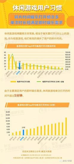 休闲类游戏除了占领了大部分受众之外,他们的唤醒频次也是非常高的,相当于每天要打开3次以上的游戏。作为轻度游戏,他们有效的填补了用户的碎片时间,并且利用不同的关卡及分享的榜单来促进用户持续游戏,以提升游戏的生命周期及留存情况。相比之下,休闲类游戏的持续使用时长上则没有一些重度游戏要高,在手游行业中处于中等水平,平均一周要使用一个半小时,由于需求较碎片,他们单次打开的时间不超过5分钟。