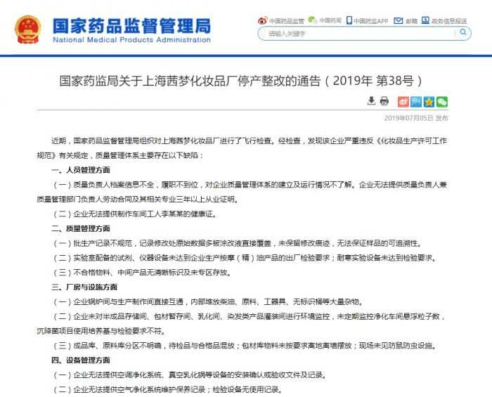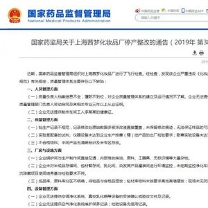 7月5日,国家药监局发布公告称,近期国家药监局组织对上海茜梦化妆品厂进行了飞行检查,发现该企业严重违反《化妆品生产许可工作规范》有关规定,质量管理体系存在缺陷。国家药监局要求上海市药监局责令上海茜梦化妆品厂暂停所有化妆品的生产销售,对该企业涉嫌违法生产行为依法严肃查处。