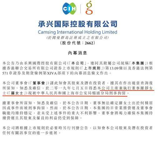 7月5日,A股上市公司$博信股份(600083)$ 和港股上市公司$承兴国际控股(02662)$ 公告,公司实际控制人兼董事长罗静女士、董事兼财务总监姜邵阳先生分别于2019年6月20日、6月25日被上海市公安局杨浦分局刑事拘留。一时间,博信跌停,由于港股没有跌停板,承兴直接跌成仙:
