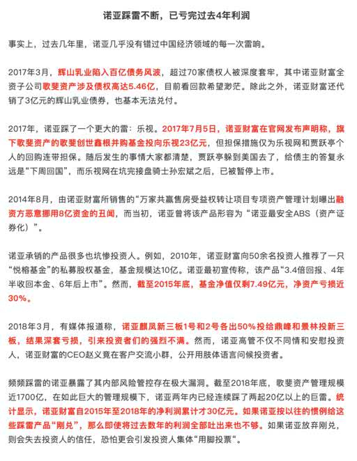 最后的问题是,这34亿会不会是冰山一角,背后会不会引发连环爆?诺亚作为一个6000亿财富管理公司,其中埋下了多少雷?这件事会不会引发刚兑?
