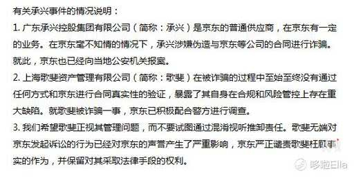 随后,不知道是不是作为回应,京东再次说明:承兴只是京东一个普通供应商,并不知道存在诈骗,而歌斐资产在被诈骗过程中暴露了自身的合规和风控重大缺陷。