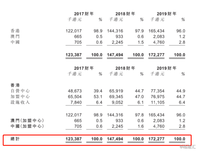 再从其地区的收益情况来看,蒙奇千里的收益主要来自香港地区,于2017至2019财年分别占总收益的98.8、98%以及96%。而澳门和中国大陆地区所占比例微乎其微。