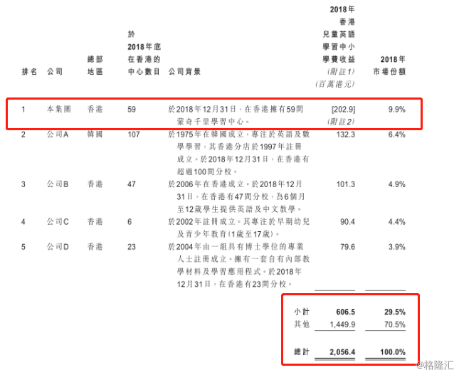 据资料显示,香港约有800间儿童英语学习中心,预计在未来还将持续增长。目前,香港儿童英语学习行业竞争格局相对分散,按2018年香港儿童英语学习学费收益计,五大市场参与者仅占市场份额约29.5%。公司于2018年的收益约为2亿港元,按香港儿童英语学习中心学费收益计排名第一,市场份额约为9.9%。据招股书,公司计划进一步扩大Monkey Tree,进一步增加市场份额。