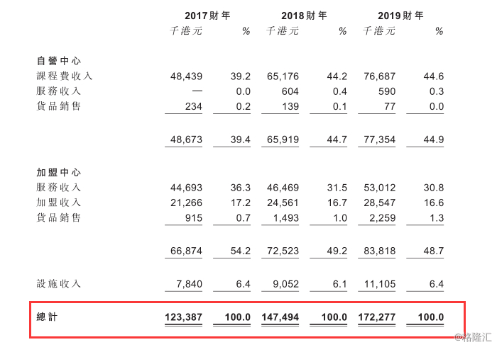 具体来看各产品类别的情况,蒙奇千里的收益主要包括自营中心、加盟中心以及设施收入。