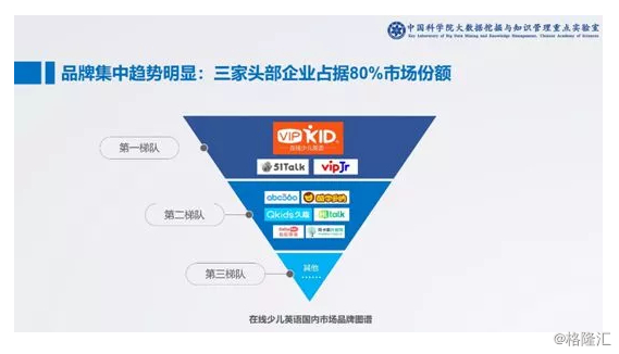其次,随着5G时代的到来和网络科技的发展,在线学习应运而生,根据中科院市场调查显示,目前国内在线少儿英语教育市场仅经过四年的发展期,虽还处于较早期的阶段,但是已经越来越被家长认可。中科院大数据实验室预计,在2022年在线教育市场将反超线下。目前在市场份额方面,目前排名前三名的企业分别是VIPKID、51Talk、vipJr,这三家品牌占据市场80%以上的份额,其中VIPKID占额55%。