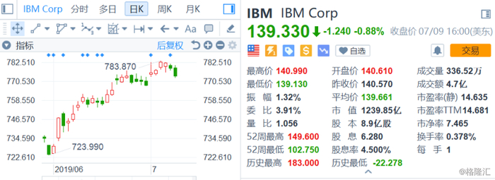 而截止到昨日该收购案的正式完成,其二级市场的走向也并不活跃。从盘面上来看,昨日收盘,IBM股价下跌0.9%至139.33美元,总市值为1239.5%。