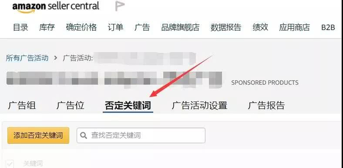 在[广告活动]中,有个[否定关键词]的选项,在这里可以添加否定关键词,告诉亚马逊这些关键词我不需要匹配广告位。添加成功之后,当买家的搜索词与你的否定关键词匹配时,否定关键词则会阻止你的广告展示。