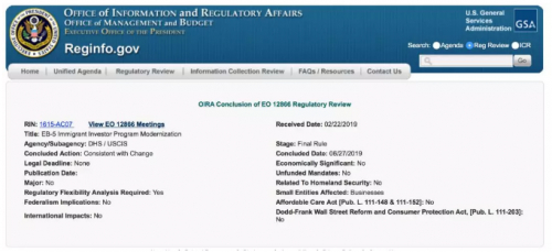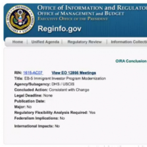 国内移民行业老牌机构外联出国近日从美国了解到,备受关注的EB-5美国投资移民改革又有新动向。6月27日,白宫预算管理办公室(OMB)发出重要公告:移民局的EB-5改革法案已经审议完毕。经过移民局的最终修改和调整即将在联邦公报上公布,形成最终的法规。