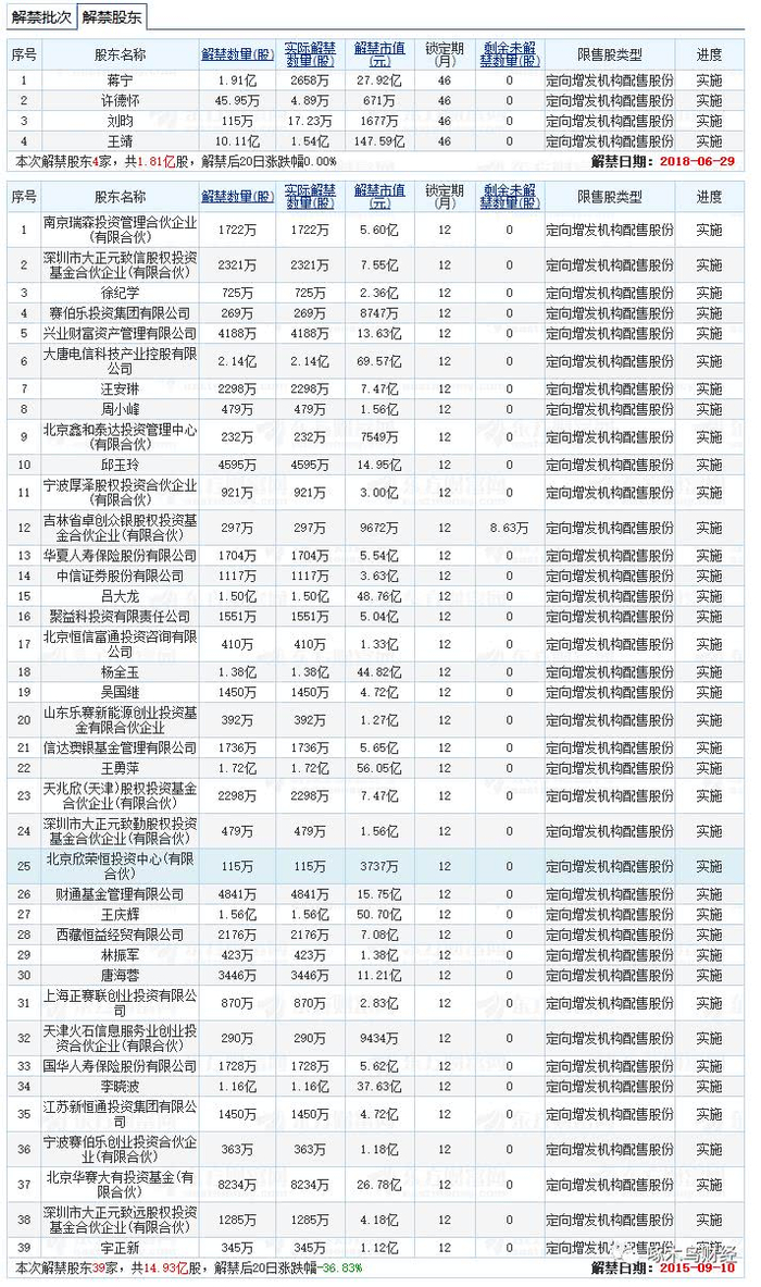 啄木鸟财经(ft-news)统计,2015年9月10日,*ST信威曾一次性解禁39家股东共14.93亿股,按照2015年9月10日的开盘价计算,当时的解禁市值高达485.6729亿元。自解禁日开始,解禁后20日涨跌幅-36.83%。