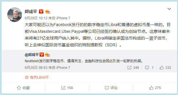 而著名经济学家郎咸平发布微博称,Libra听上去神似国际货币基金组织的特别提款权(SDR)。