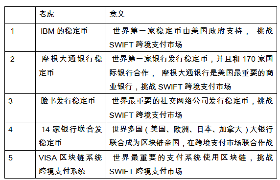 而更早的时候,美国企业IBM摩根大通等已推出同类稳定币。根据蔡维德统计,迄今为止,美国企业及全球重要银行联手,已推出5种稳定币,蔡维德将其称为5只老虎: