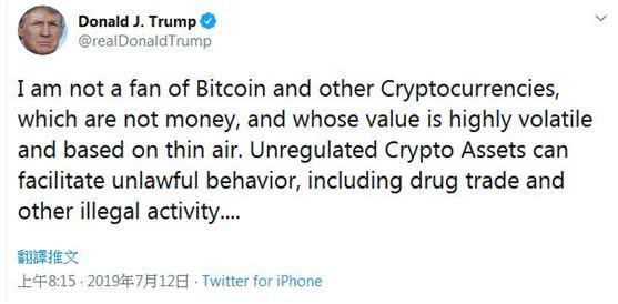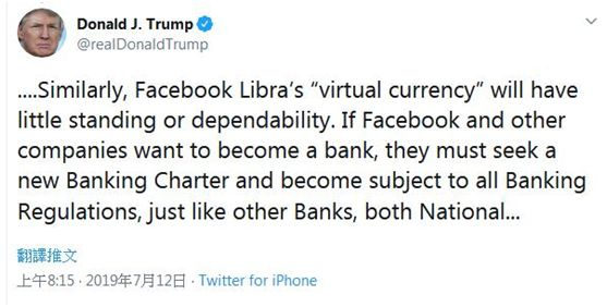7月12日,特朗普发表了三条推特,直言对Libra和“虚拟货币”的看法。