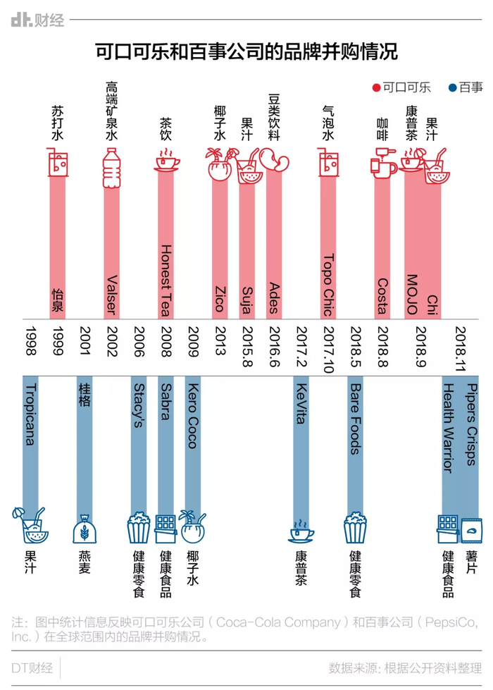 2018年,百事又收购了两家主打健康的食品品牌。同一年,可口可乐的动作则更大一些,出资39亿英镑,买下英国咖啡老牌Costa ,进军大热的咖啡市场。