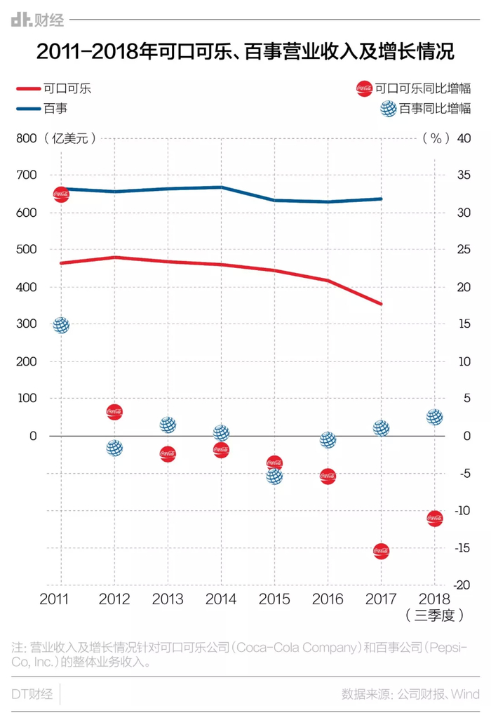 不过,当我们查看这两家公司真金实银的经营数据,可口可乐的生意做得却有点不尽如人意。2017年,可口可乐与百事的营收差距超过200亿美元。