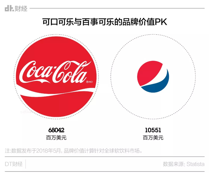 在各类品牌价值排行榜中,可口可乐的排名也比百事领先很多。最新数据来自德国统计公司Statista于2018年5月份发布的榜单,可口可乐的品牌价值约为百事可乐的6.4倍。