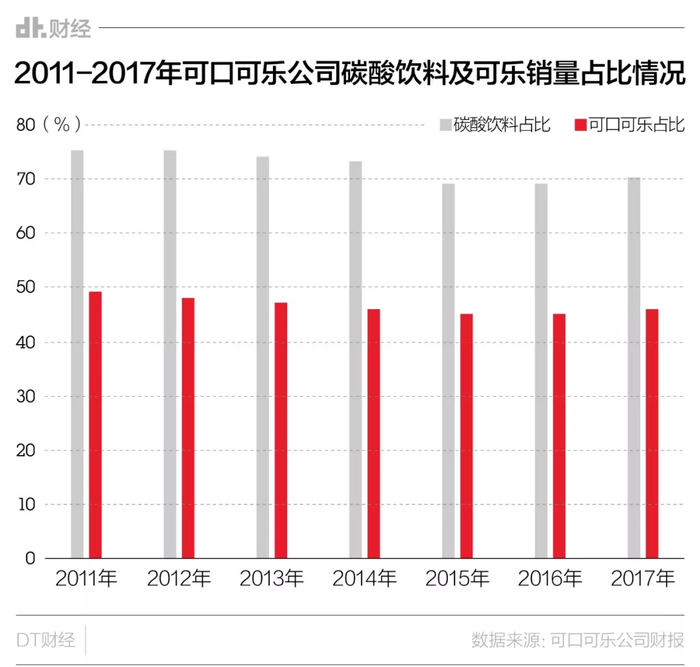 2011年,碳酸汽水在可口可乐的整体销量中占到75%,到2017年年底,这个数字降低到70%,其中可乐的销量占比也从2011的49%下降到2017年的46%。