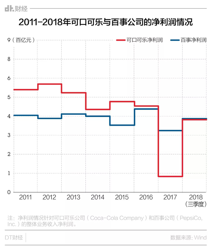 从净利润来看,原本领先的可口可乐,近年来也一直在下滑,不再有优势。直至最新公布的2018年前三季度数据,可口可乐在净利润层面仍未能挽回劣势。