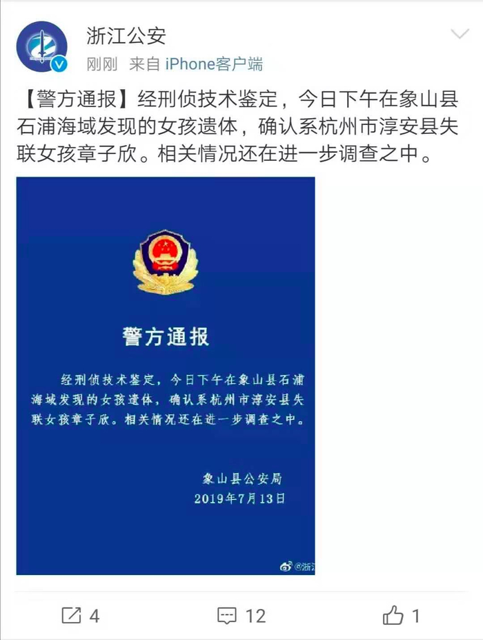 7月13日21:30,象山县公安局发布通报:经刑侦技术鉴定,下午在象山县石浦海域发现的女孩遗体,确认系杭州市淳安县失联女孩章子欣。