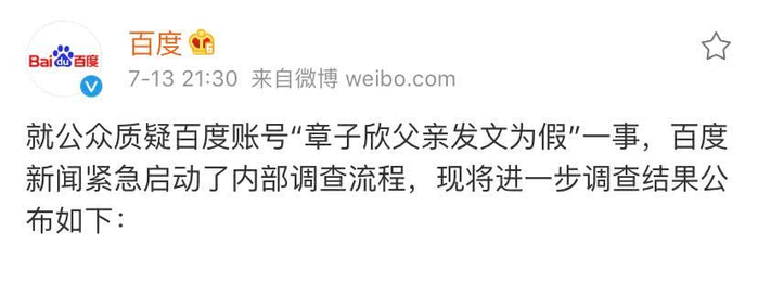 当晚21:30,官方账号@百度 再次回应“章子欣父亲发文为假”一事。