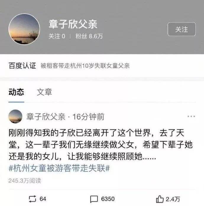 但在警方发现遗体,身份尚未确定之际,女童父亲却陷入了一场舆论风波。百度上名为“章子欣父亲”的认证账号发文称,“这一辈子我们无缘继续做父女,希望下辈子她还是我的女儿......”,引发大量转发。