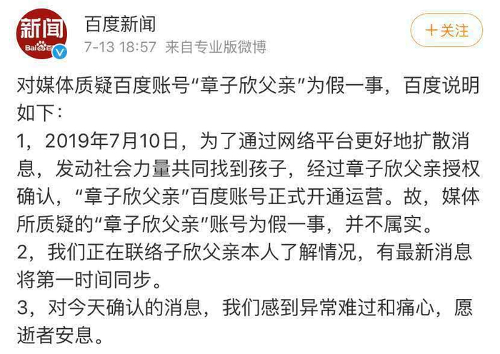7月13日18:57,@百度新闻 对媒体质疑“章子欣父亲”百度账号为假一事做出回应,称经过章子欣父亲授权确认,该百度账号正式开通运营。“故,媒体所质疑的‘章子欣父亲’账号为假一事,并不属实。”