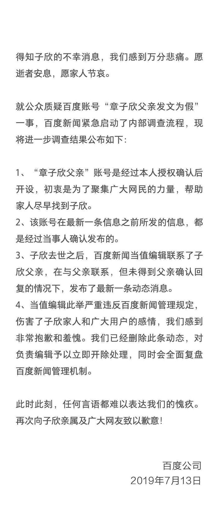 遗体确认是章子欣后,百度道歉回应“章子欣父亲发文为假”,网友怒了