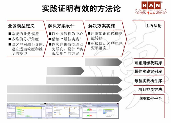 1,业务设计:汉普坚持了专注行业的业务战略,公司组织上,形成了以钢铁、汽车机械、交通、贸易以及区域销售划分的销售型事业部,和管理咨询、SAP、Oracle、定制软件开发等四大专业事业部相交叉的矩阵式结构,并且还建立了从事运维支持业务的“支持服务中心”以及由售前专家团队组成的“汉普研究院”。下图是现在在百度文库里还能搜得到的汉普介绍PPT,这些片子是2007年底,由我本人亲手原创绘制的。其后一年多,当我加入IBM后发现,汉普的这个组织结构居然和IBM GBS一模一样,行业事业部相当于IBM GBS的Sector,也有大客户和区域客户之分,而几个专业事业部的设置和IBM GBS的service lines的设置几乎一样,甚至比IBM早几年就设置了专门的负责运维服务的AMS部门,而研究院则相当于IBM GBS的商业价值研究院。