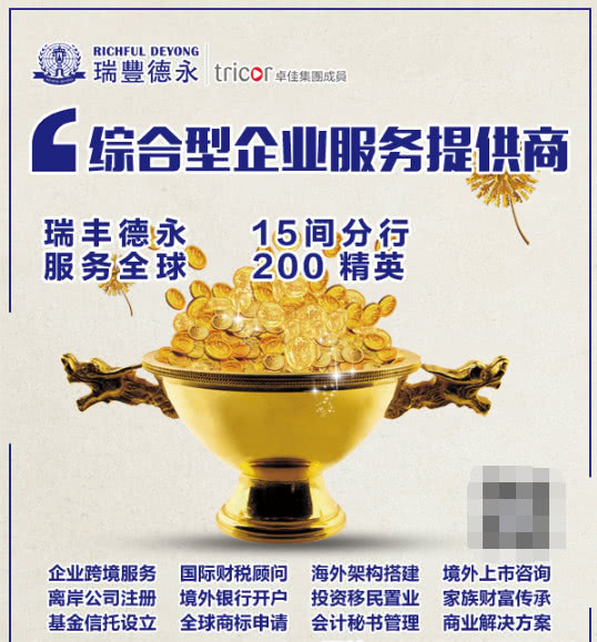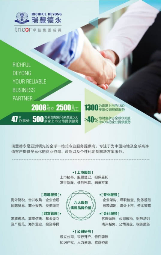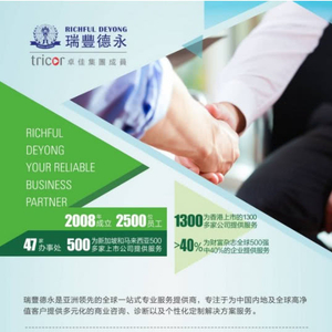 瑞丰德永(Richful Deyong)2008年始创于香港,系卓佳(Tricor)集团成员,是亚洲具有领先地位的专业服务机构,在全球21个国家/地区47个城市设有办事处,拥有2500多名员工,服务超过30000多客户,1300间香港联交所上市公司,500间新加坡和马来西亚上市公司,名列财富杂志500强企业超40%及众多跨国知名公司。