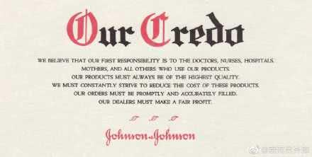 在1943年,小罗伯特· 伍德· 强生写下Our Credo,共308条,强生历任高管均须尊此信条行事。
