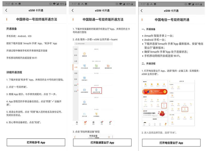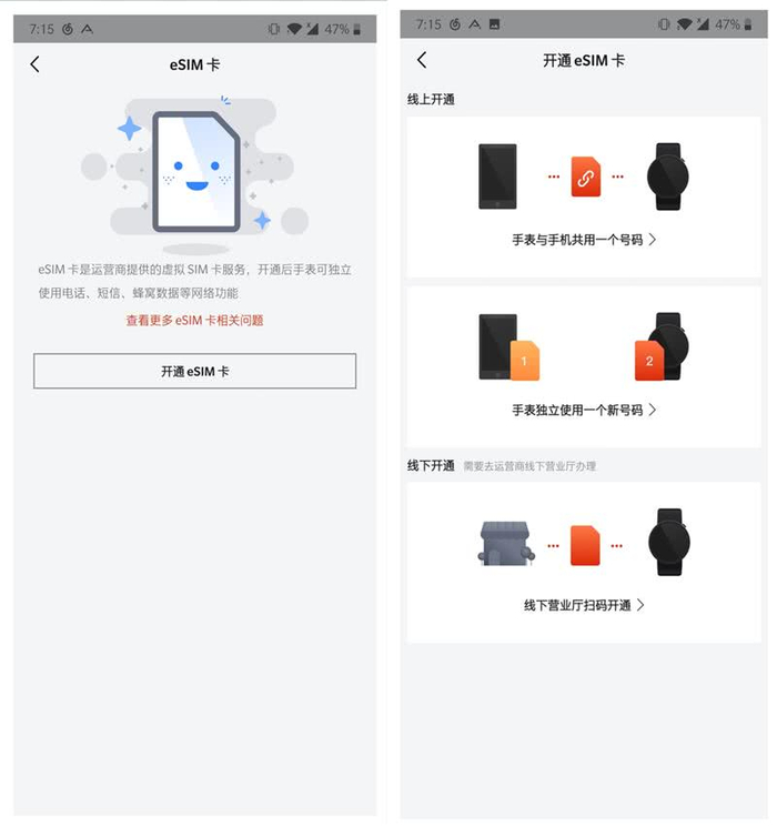 无论是移动、联通还是电信,华米智能手表2e的SIM功能开通、使用都无需实体电话卡。其可以通过内置的eSIM蜂窝网络模块来实现独立通话功能,开通eSIM业务的过程可在手机APP上完成,也可前往线下营业厅扫码开通。